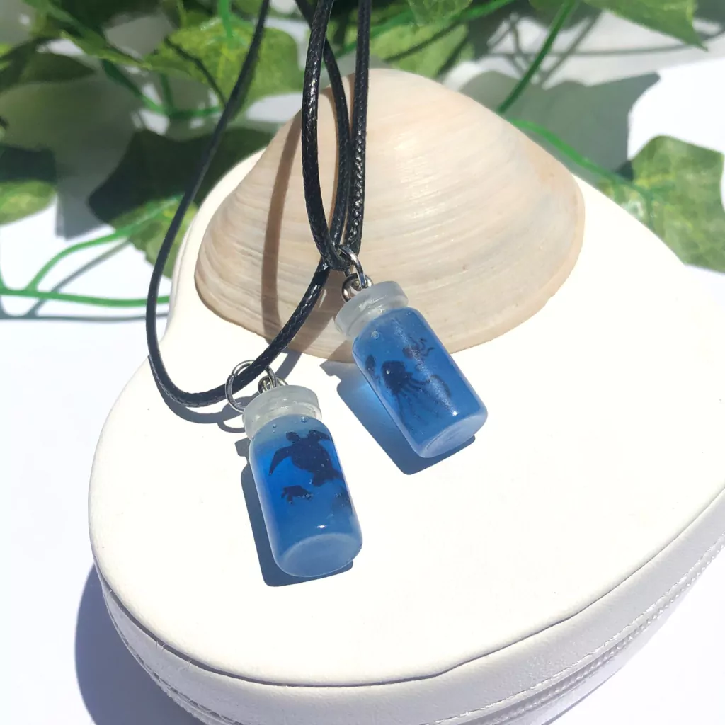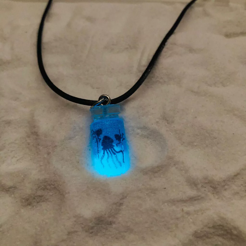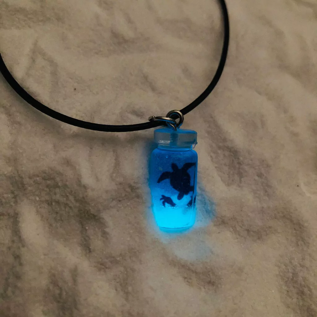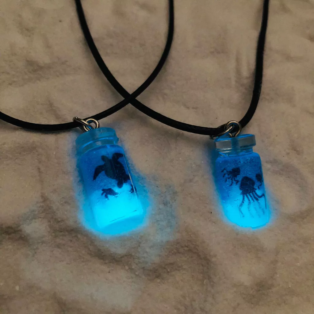 Tenha um pedacinho do oceano com você em todos os momentos! O Colar Potinho de Oceano faz parte da Coleção Mar, é feito de resina com desenhos de águas-vivas e tartarugas, que ficam mais evidentes quando o colar brilha no escuro ♥